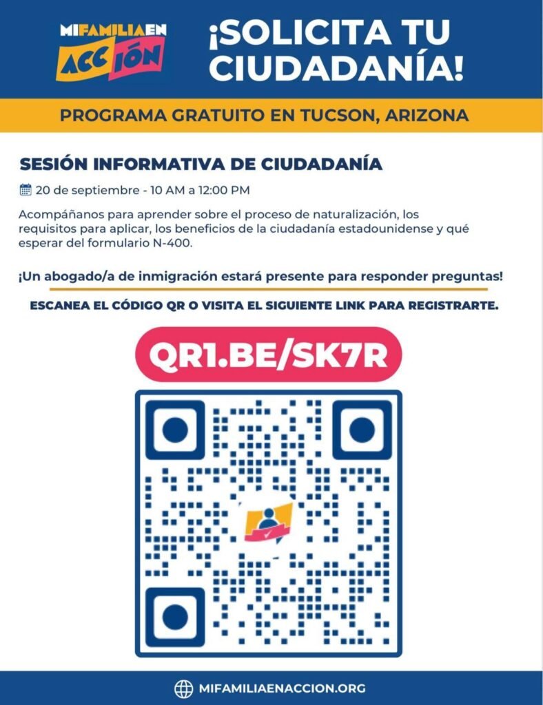 Mi Familia En Acción es una organización nacional sin fines de lucro que ayuda a personas a hacerse ciudadanos de Estados Unidos. Mi Familia tendrá una sesión informativa este sábado 20 de septiembre con la presencia de un abogado para responder las preguntas de los residentes de Tucson sobre cómo solicitar la ciudadanía estadounidense y qué esperar del proceso antes, durante y después de iniciar la solicitud.