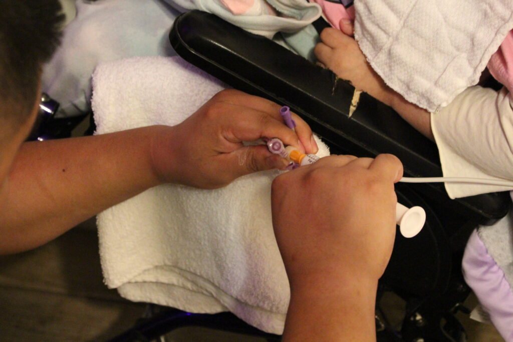 Una tarde reciente, Carlos interrumpió la alimentación de Nicole para administrarle medicamentos mediante la sonda colocada en su abdomen, hasta el estómago. Nicole dormía en su silla de ruedas, tranquila, mientras él cambiaba brevemente la fórmula de su medicamento. Luego, le acercó la boquilla de un nebulizador a la nariz y la boca para que pudiera inhalar albuterol, su tratamiento para el asma.